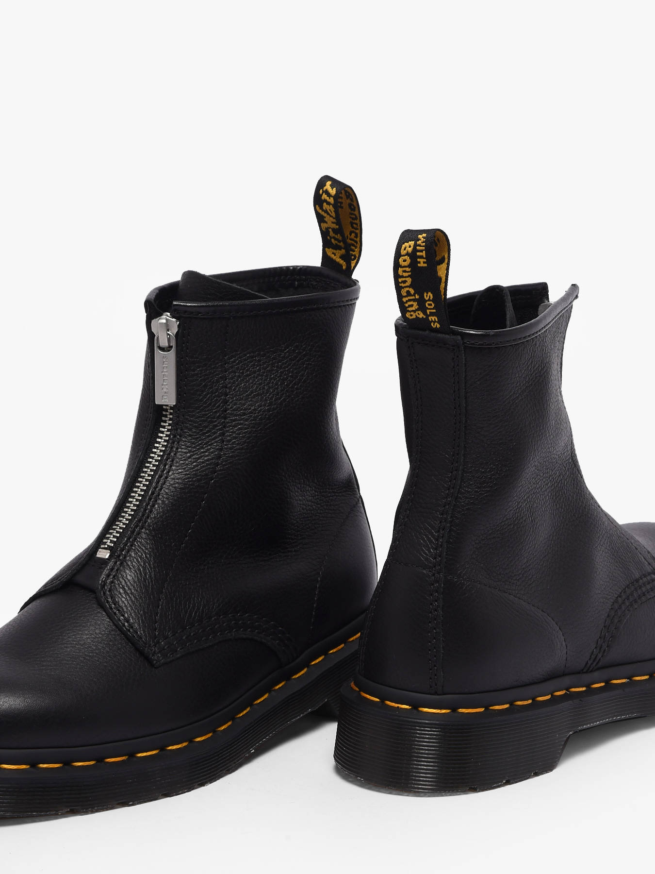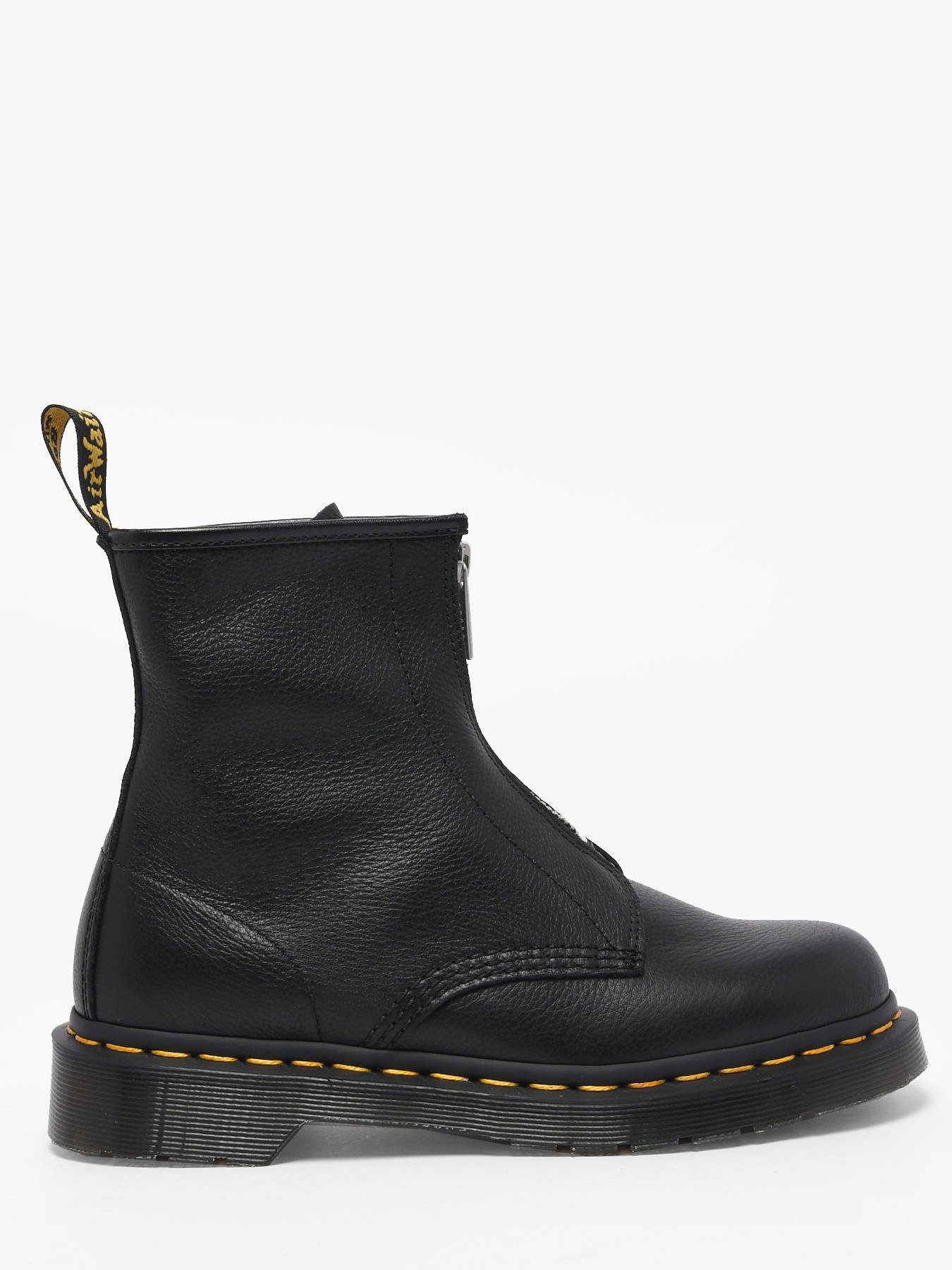 The 1460 boots from Dr Martens in black Virginia leather reinvent an icon with a contemporary twist and ultimate comfort. Their soft, fine-grain leather wraps the foot with supple ease, while the signature yellow stitching and heel loop celebrate six decades of Dr Martens heritage. The front zipper replaces traditional laces for easy on and off while maintaining the model’s iconic look. Resting on the classic Doc’s sole, durable and timeless, these boots combine strength and legendary style. Versatile and bold, they are a must-have to carry the season with confidence, comfort, and the unmistakable rebellious, rock identity of Dr Martens.