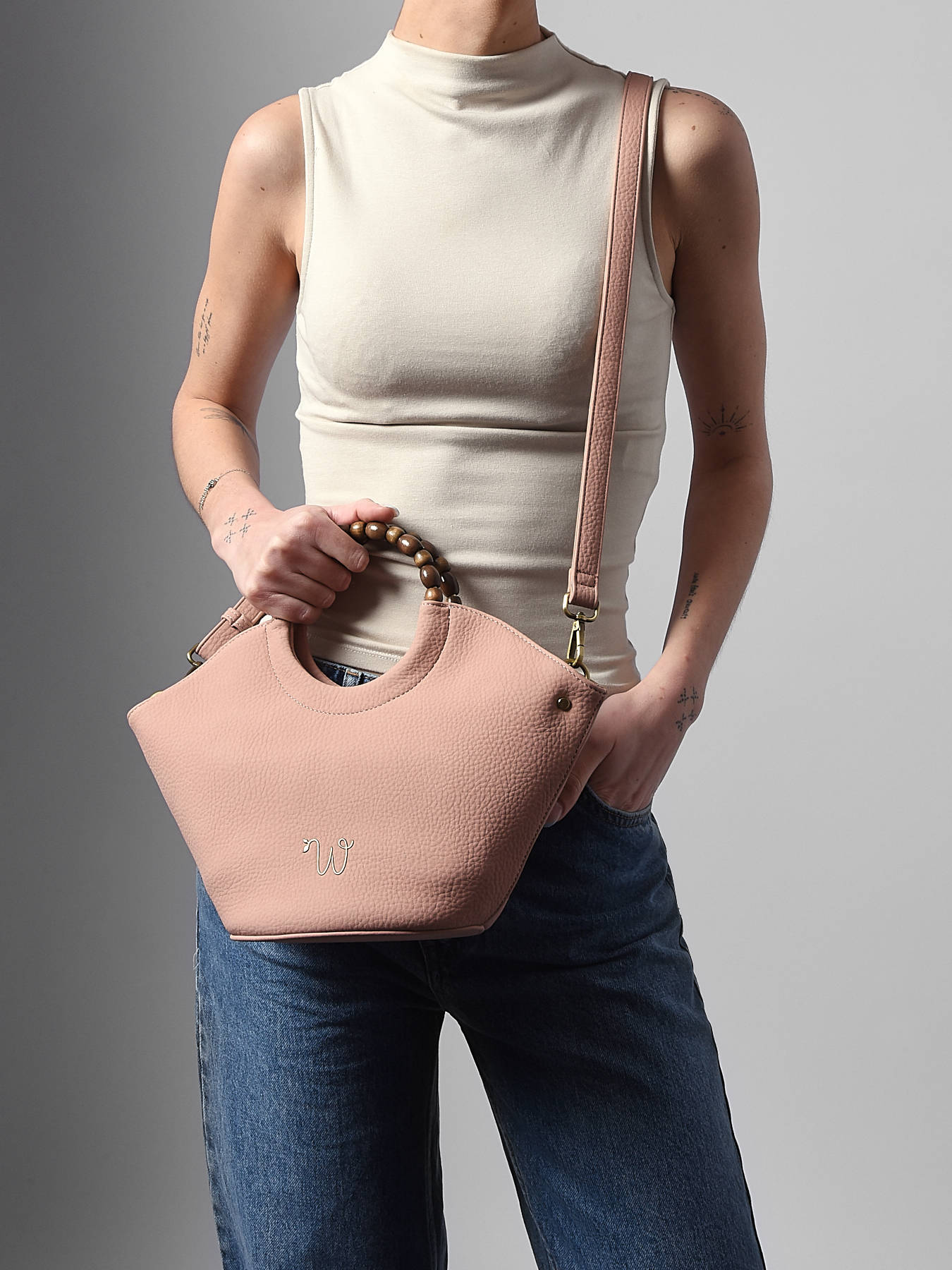The small-format WOOMEN crossbody bag from the Neflier Pearl line combines elegance, practicality, and sustainable design. Its main material, polyurethane composed of 58% recycled materials, paired with a cotton and linen lining, ensures both lightness and durability. The wooden beaded handle adds originality and sophistication to the model. This bag features a zip closure, a zip pocket at the back, and a removable polyurethane strap for versatile wear, while inside, a zip pocket and a slip pocket keep your essentials organized. The gold-tone resin logo completes the design, elevating your outfits with a refined touch.