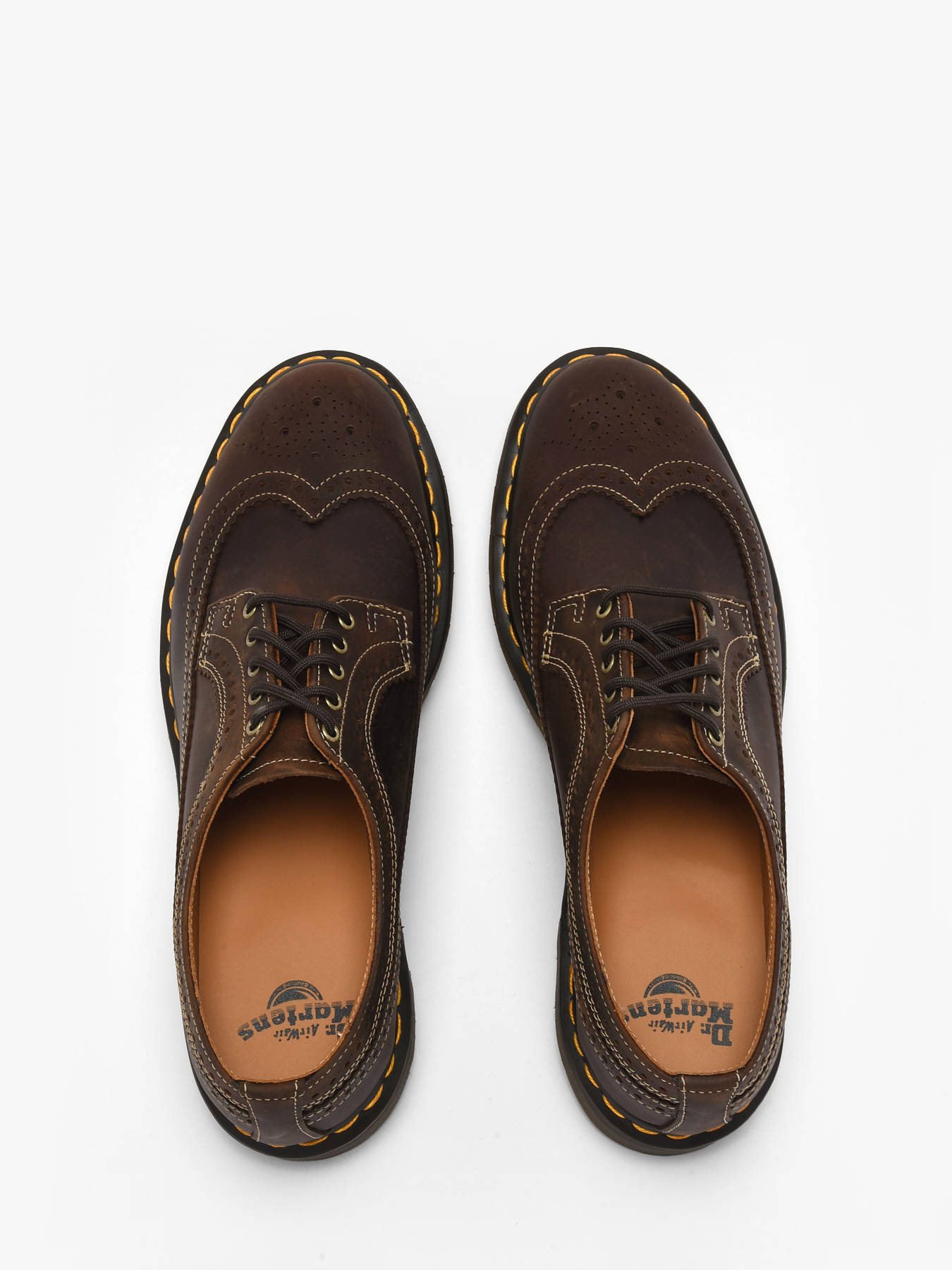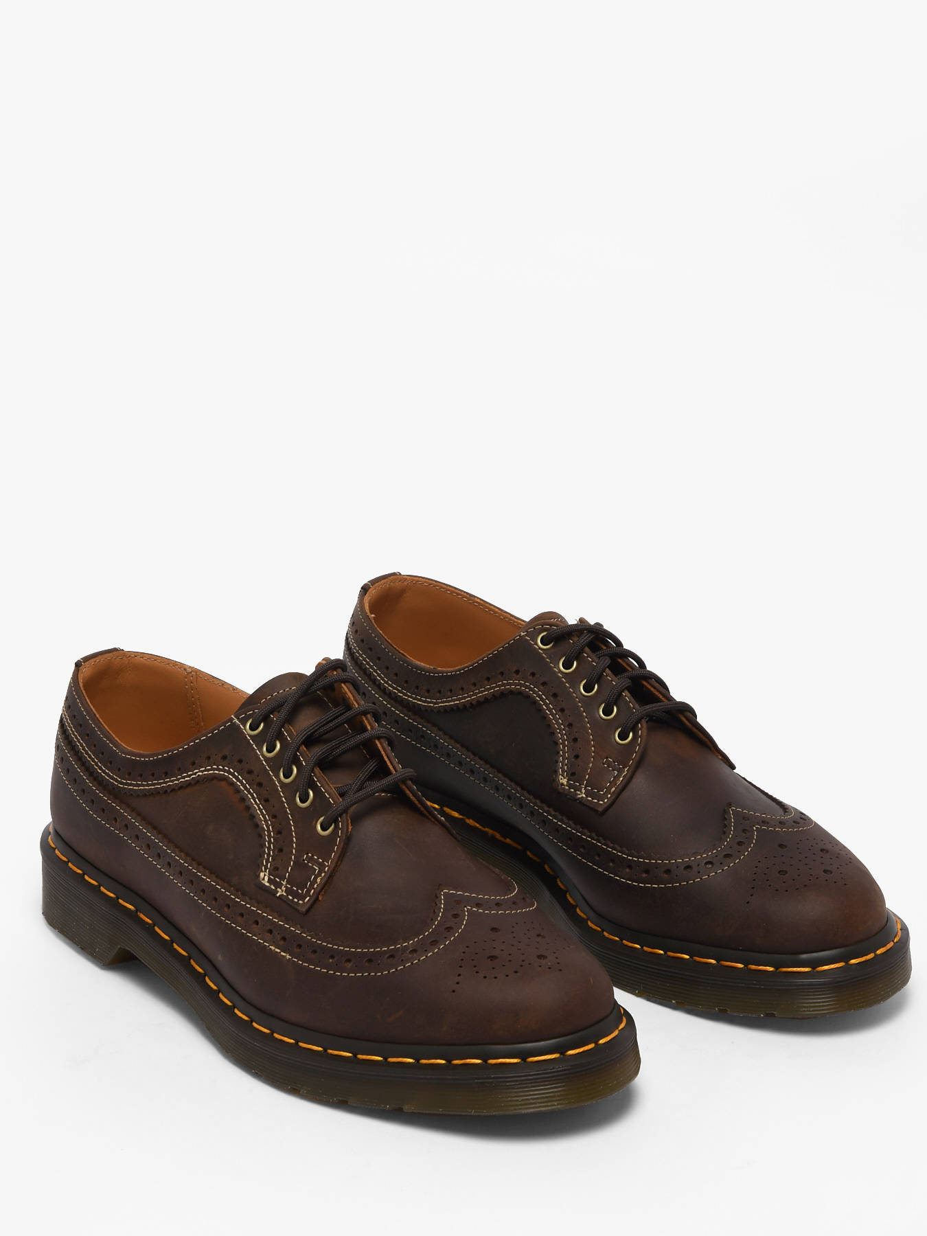 The 3989 Derby shoes from Dr Martens in dark brown Crazy Horse leather combine tradition and character for a bold everyday style. The thick textured leather, enhanced by natural scuffs and marks, develops a unique patina over time, while the derby details and contrasting stitches highlight the model’s distinctive elegance. The Doc’s reinforced sole with yellow stitching provides durability and comfort, complemented by aged gold finishes and tone-on-tone laces for a refined, authentic look. Versatile and timeless, these derbies are a must-have for anyone wanting to face the day in style, confidence, and with the iconic Dr Martens signature.