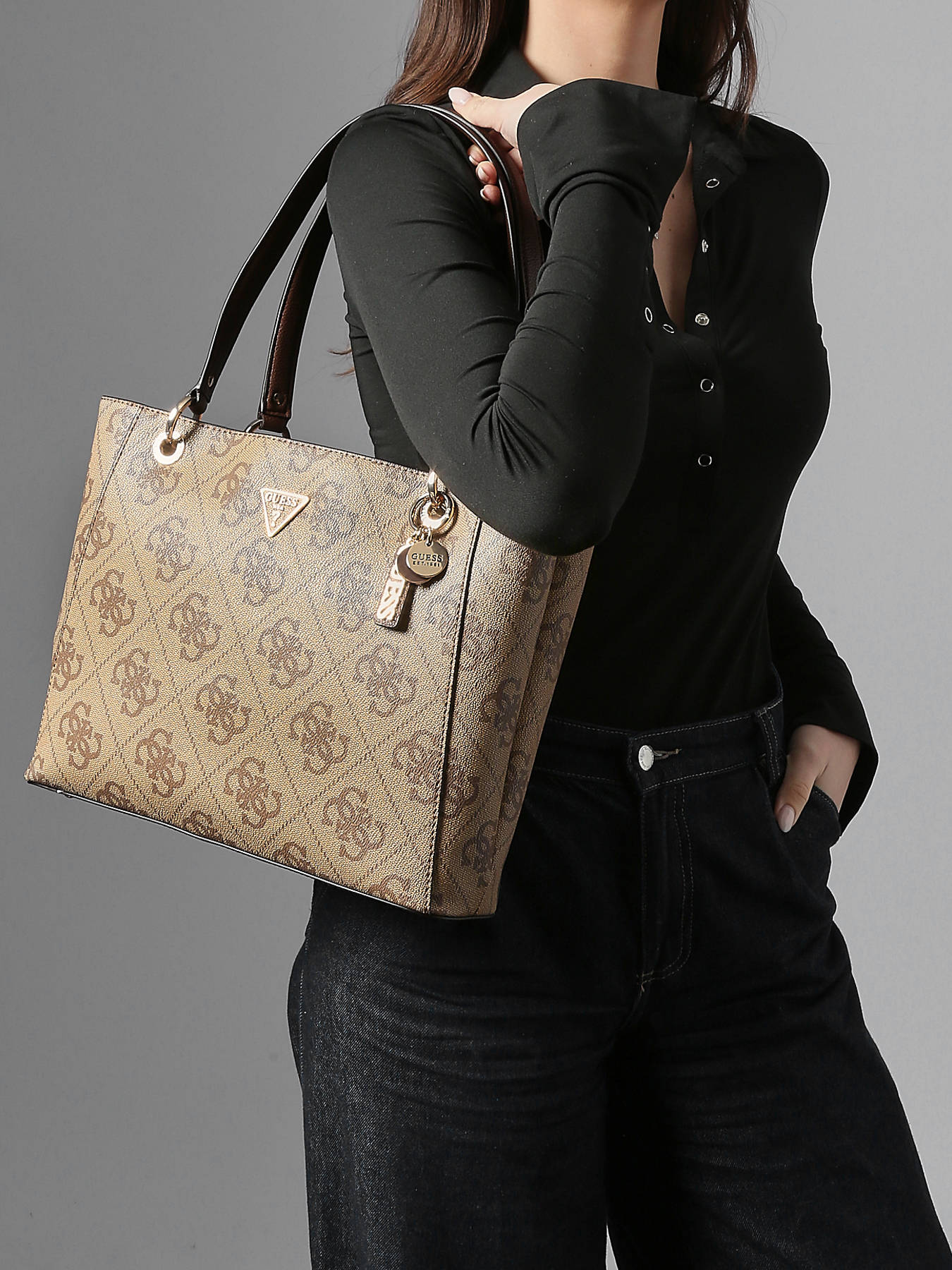 The NOELLE GUESS shoulder bag, made of P.U., perfectly combines elegance and practicality for everyday use. Its exterior features a zip closure that ensures the security of your belongings while providing easy access. With a handle height of 26 cm, it is comfortably worn on the shoulder, offering a chic and modern style. Inside, the bag has two spacious compartments for optimal organization. Four simple pockets are available to store your small essentials, while a zipped pocket secures your valuables. Versatile and functional, the NOELLE GUESS bag is the perfect companion for work, outings, or special occasions.